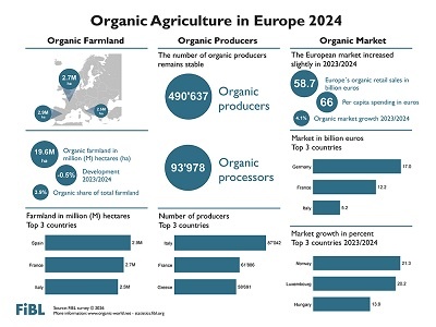 En 2024, Alemania se mantuvo como el mayor mercado de productos ecológicos de Europa (17.000 millones de euros), seguida de Francia (12.200 millones de euros) e Italia (5.200 millones de euros). Las ventas minoristas de productos ecológicos en Europa alcanzaron los 58.700 millones de euros (UE: 49.500 millones de euros), con un aumento del 4,1 % en Europa y del 3,6 % en la Unión Europea. Suiza registró el mayor consumo per cápita a nivel mundial, con 481 euros por persona, y la mayor cuota de mercado de productos ecológicos a nivel mundial, con un 12,3 % de las ventas totales de alimentos en 2024.